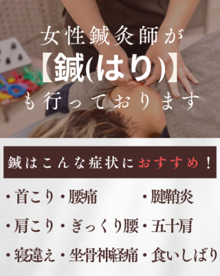 当院では産前産後の身体のケアを主に施術しておりますが、有り難いことに旦那様やお子様、ご友人の方などへご紹介いただけることがとても多いです。頭痛や首こり、肩こり、腰痛にお悩みの方、ぎっくり腰やスポーツでケガをされた方、鍼灸を受けられたい方もお気軽にご予約ください。美容鍼や小顔整体など美容系のメニューもご用意しております。それぞれのお悩みに寄り添い、安心して通っていただけるよう心がけております。